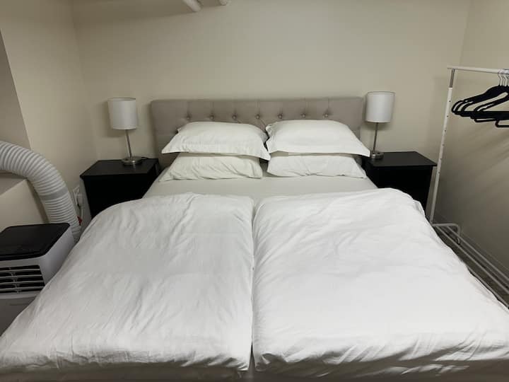 Utaweza kufikia chumba 1 cha kulala na maeneo ya pamoja katika fleti hii ya chini ya ardhi. Maeneo ya pamoja ni: Jiko na bafu. Sehemu za pamoja zinaweza kutumiwa pamoja wakati wageni wengine wanakaa kwenye chumba kingine cha kulala. Hakuna sebule katika fleti hii!