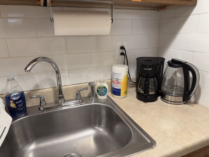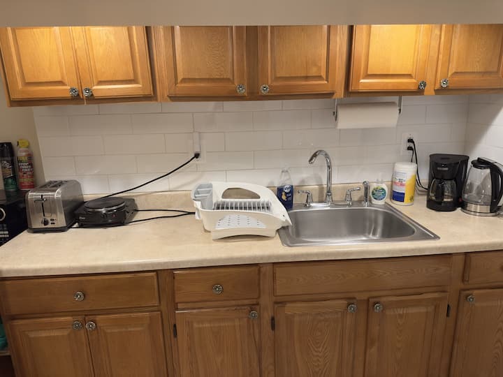 Jiko lina vifaa kamili vya kupikia na lina vifaa vipya. Kwa sababu hii ni fleti ya chini ya ghorofa, badala ya jiko/oveni kuna burner ya umeme pekee.