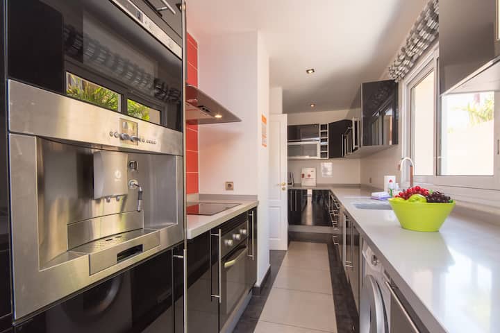 Vila ina ghorofa 2 na inajumuisha mapambo ya kimaridadi na ina vifaa kamili. Milo iliyopikwa nyumbani inaweza kutayarishwa katika jikoni kubwa la kisasa na eneo la kulia la karibu. Asubuhi na jioni zinaweza kutumika katika sebule kubwa, ukilala kwa starehe kwenye sofa yenye umbo la L ukitazama runinga iliyo na vituo vya Uingereza.