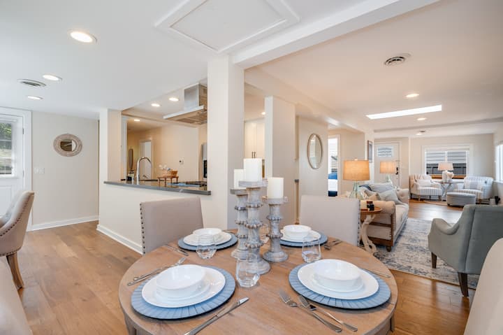 Kunywa vinywaji unavyopenda na ufurahie upepo safi kwenye ua wa mbele huku mpishi wa familia akifanya kazi ya ajabu katika jiko lililo na vifaa kamili au kwenye jiko la kuchomea nyama. Mara baada ya chakula kuwa tayari, kusanyika karibu na meza ya kulia ya kuvutia na ujifurahishe na karamu ya kumwagilia kinywa.