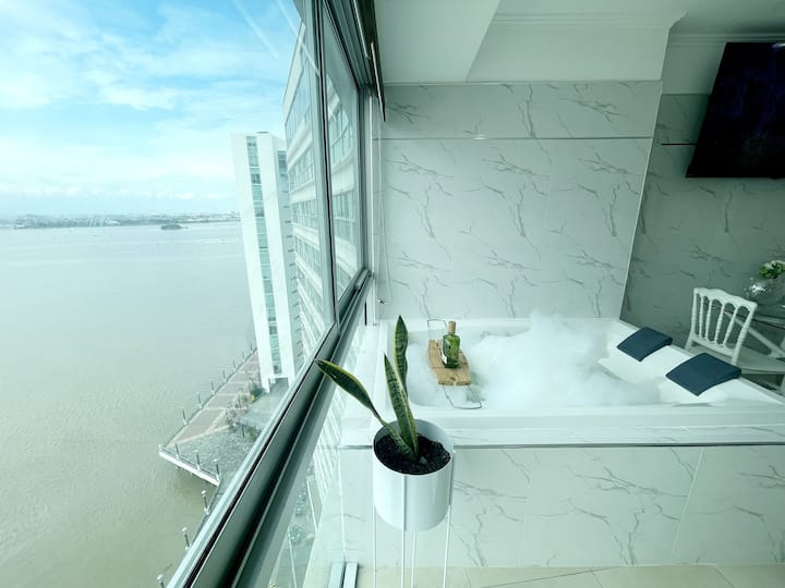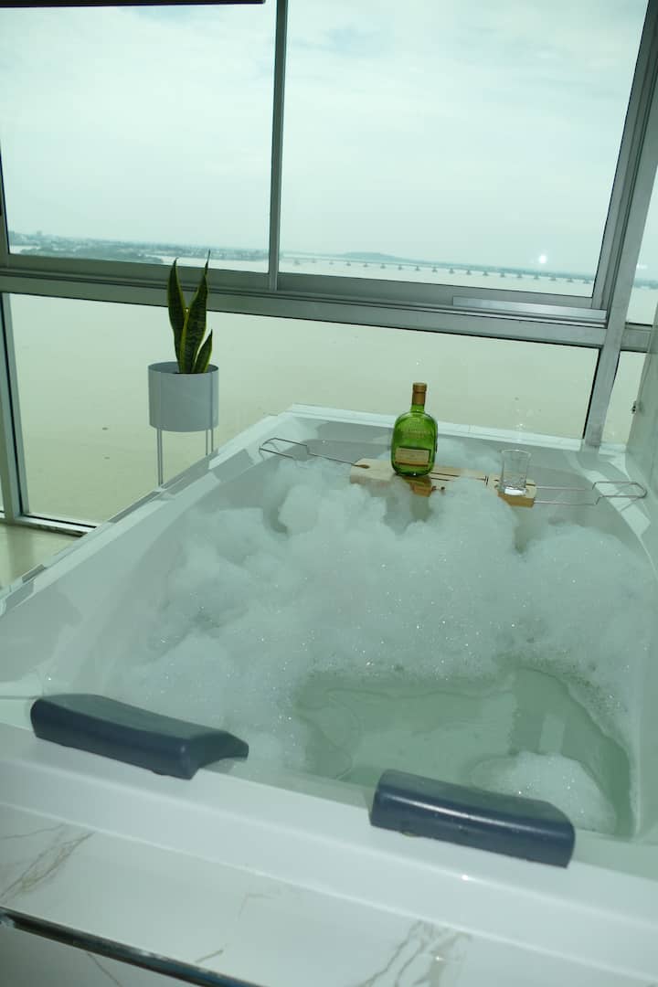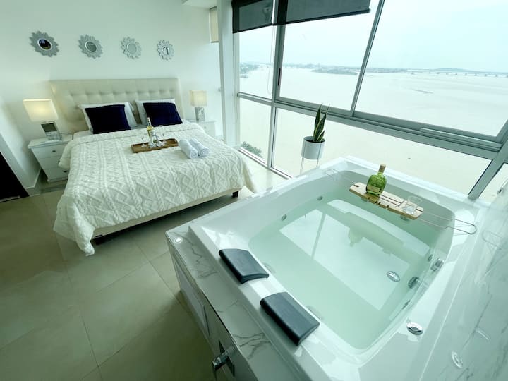 Chumba cha Penthouse kilicho na beseni la maji moto linaloangalia Mto XI