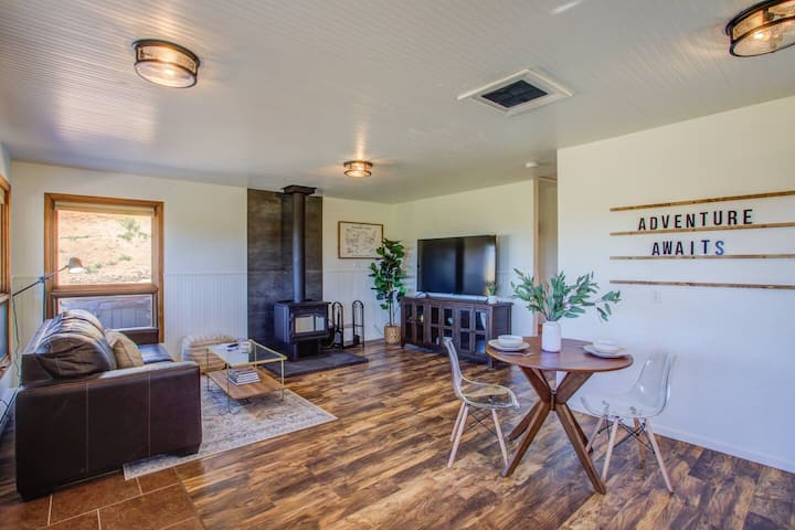 Ingia ndani ya nyumba ya mbao na kusalimiwa na mambo ya ndani yaliyokarabatiwa hivi karibuni ambayo huchanganya haiba ya kijijini na starehe za kisasa. Mpangilio wa wazi na mpana hutoa mazingira ya kuvutia kwa ajili ya kupumzika na kushirikiana. Pumzika ni eneo la kuishi lenye starehe, ambapo madirisha makubwa yanaunda milima mizuri, ikiruhusu mwangaza wa asili kufurika sehemu hiyo. Kwa ajili ya burudani, kubwa flatscreen TV watapata, kuhakikisha wewe kamwe miss inaonyesha yako favorite au sinema. Jikoni kuna chochote unachoweza kuhitaji kupika kitafunio cha haraka au chakula kikubwa. Kuna maoni mazuri kutoka kila dirisha unapotembea kupitia nyumba ya mbao. Utapata bafu la kati na bafu kubwa la ziada, ubatili mkubwa na mashine ya kuosha na kukausha. Kisha utaingia kwenye chumba kikubwa cha kulala nyuma ya nyumba ya mbao. Imewekwa na kitanda cha mfalme wa kumbukumbu. Kuna kiti cha ofisi cha starehe na dawati kubwa lililo na kituo cha malipo na mtandao wa Starlink kwa mahitaji yako yote ya kazi ya mbali! Mwonekano wa nje wa nyumba ya mbao una staha kubwa, vitanda vya bembea na maeneo mengi ya kuchukua kwenye kitabu chako kinachofuata.