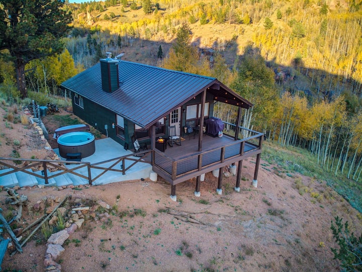 Nenda kwenye nyumba yetu ya mbao ya kisasa katika eneo la Pikes Peak. Furahia mandhari ya milima, beseni la maji moto na staha kubwa iliyozungukwa na miti ya aspen na msonobari. Nyumba hii ya kibinafsi imekarabatiwa hivi karibuni na ina TV kubwa ya flatscreen na mtandao wa kasi wa Starlink. Pata uzoefu wa maajabu ya asili unapoona kondoo wakubwa wa pembe na wanyamapori wengine. Pumzika kando ya shimo la moto chini ya anga lenye mwangaza wa nyota. Pamoja na mandhari yake ya utulivu na ukarabati mpya, nyumba hii inatoa likizo bora ya mlima.