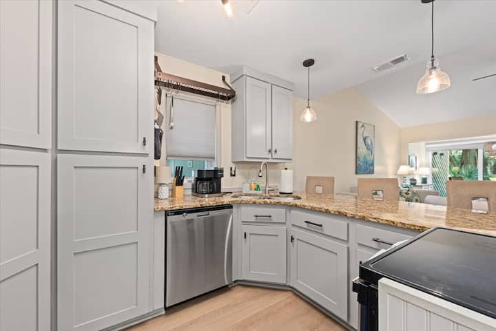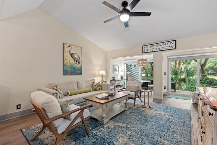 Nyumba hii ya chumba kimoja cha kulala, bafu 1.5 iko kwenye njia ya 8 ya uwanja wa gofu wa Ocean Winds. Chumba cha jua cha futi za mraba 94 kimeongezwa kwenye sebule ya ghorofa ya kwanza. Nyumba hii ya mjini iko umbali wa kutembea kutoka ufukweni/eneo la bwawa na vistawishi vingi vya Kisiwa cha Seabrook.