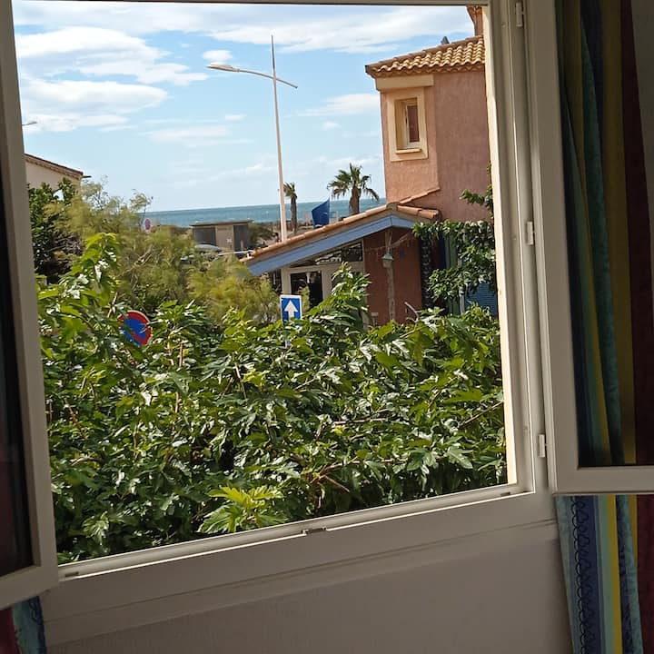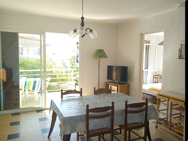 Fleti ni kwa ajili yako tu. Utakuwa na ufunguo wa lango la kuingia. Unavuka eneo la kuchomea nyama la kawaida hadi kwenye nyumba 2 za shambani ili kufikia ngazi na kufika kwenye mtaro ukiwa na mwonekano wa bahari, kwenye kitongoji na kwenye barabara ya shampeni inayohudumia ufukweni.