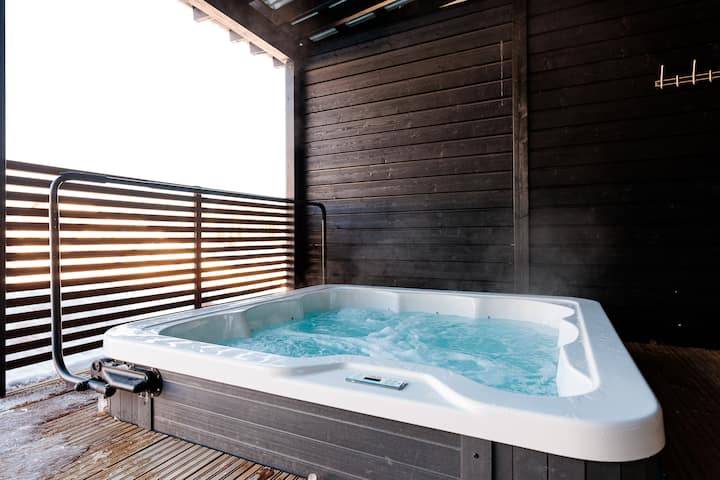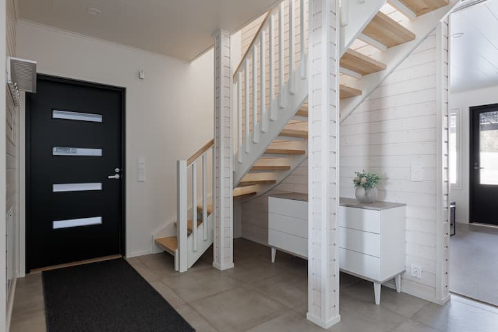 Vila hiyo ina beseni la maji moto la nje na unaweza kutumia hippie kwa urahisi kuanzia joto la sauna hadi beseni la maji moto. Beseni la maji moto la nje limehifadhiwa kwenye sitaha chini ya turubai. Pia kuna jiko la kuchomea nyama, kundi la meza na eneo la kuketi kwenye sitaha. Ua wa vila una nafasi kubwa ya magari na pia kuna nguzo ya kupasha joto ya gari uani.