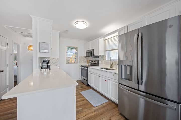 Wakati huli kwenye baadhi ya mikahawa mizuri iliyo karibu, furahia vyakula vitamu katika starehe ya sehemu hii ya kisasa. Jiko lina vifaa kamili na kila kitu utakachohitaji ili kuandaa chakula kitamu kwa ajili ya kundi lako lote. Kaa kwenye meza ya kulia chakula na uzungumze kuhusu jasura zako za pwani za kufurahisha au upendeze tu mandhari nzuri kupitia mlango wa roshani.