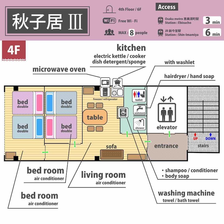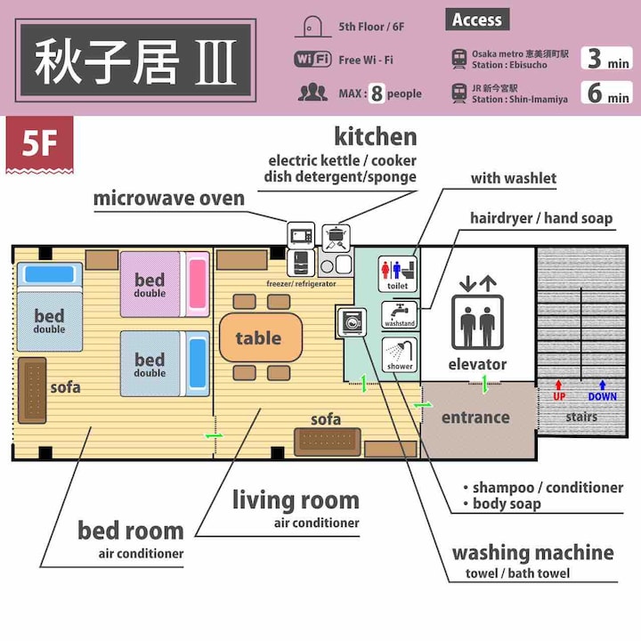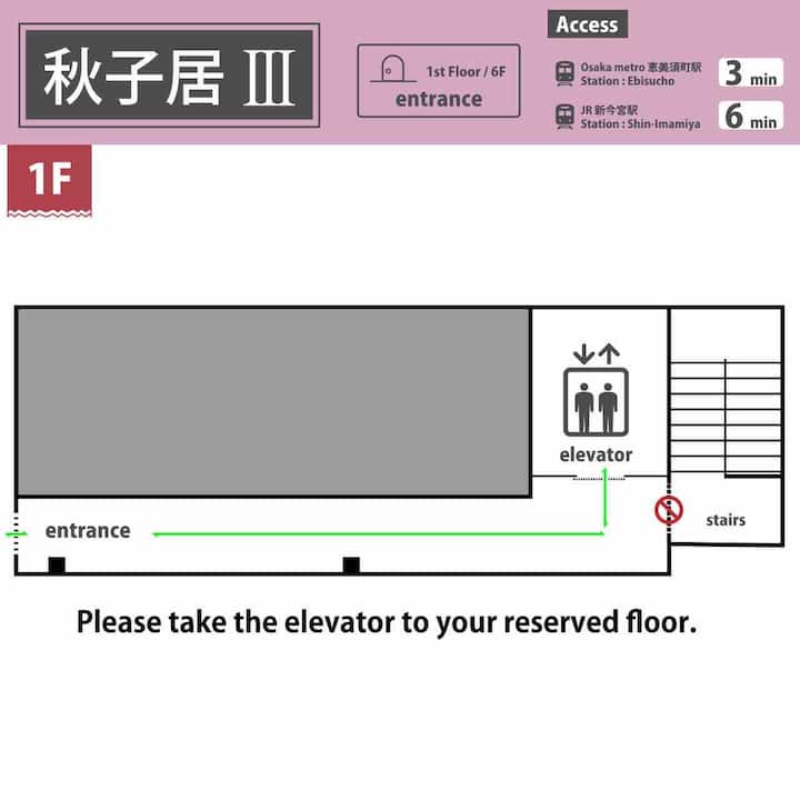 Inatoshea familia kubwa/fleti ya lifti yenye ghorofa mbili/Mtaro wa pamoja/Ufikiaji wa moja kwa moja kwenye Uwanja wa Ndege wa Kansai/dakika 2 kwa treni ya chini ya ardhi ya Dotonbori Shinsaibashi Namba