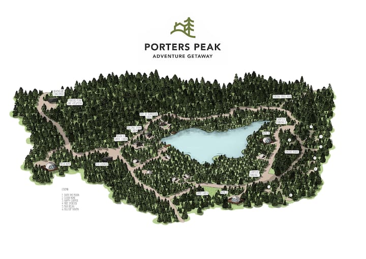 Tembea kwenye barabara kuu kutoka kwenye makazi yako hadi kwenye sehemu yetu ya kutazama. Hapa ndipo msukumo wa kweli nyuma ya Porters Peak ulipoanza. Tarajia miamba mikubwa, inukshuks mbili, vilima vinavyozunguka, Ziwa letu la Hilltop na uhakikishe kupata machweo mazuri jioni.