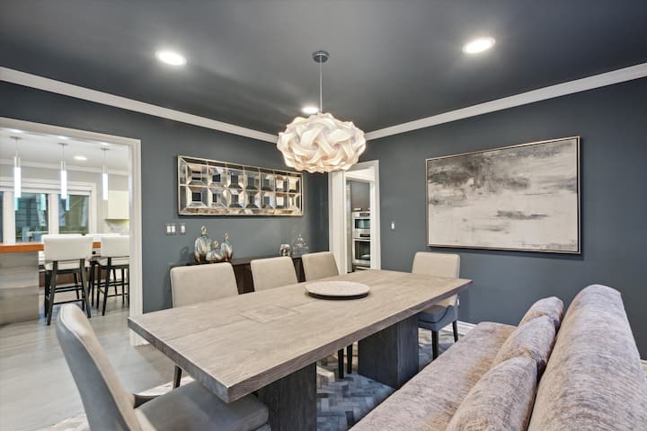 Chumba kizuri cha kulia chakula cha bluu kiko wazi jikoni na sehemu nyingine 8 za kukaa, na kufanya sehemu 14 za kukaa pamoja. Pia ni eneo zuri la mchezo wa familia, meza ya kadi au sehemu ya pili ya kazi ili ufurahie wakati wa ukaaji wako.