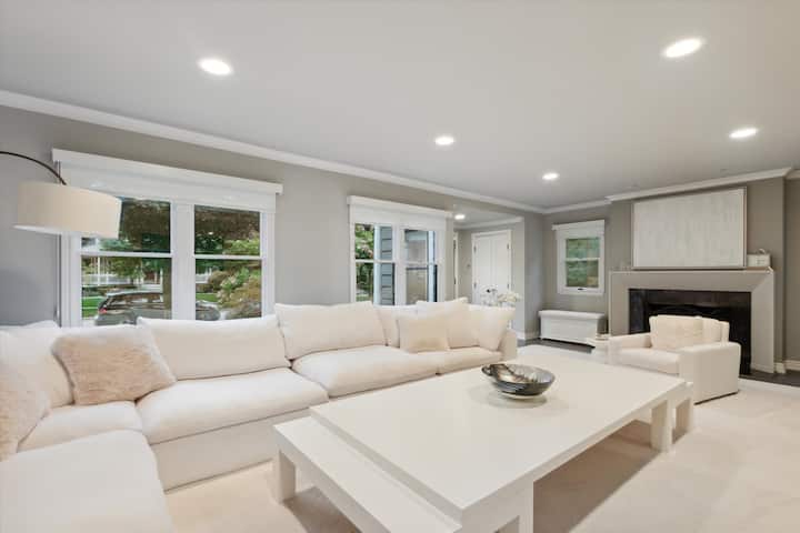 Ghorofa ya kwanza ina sebule kubwa, nyeupe ambayo inakaa 6 - 10 kwa starehe. All white Restoration Hardware Cloud sectional sofa ni sofa kamili ya mapumziko kwa familia nzima kufurahia sinema kwenye televisheni ya gorofa.