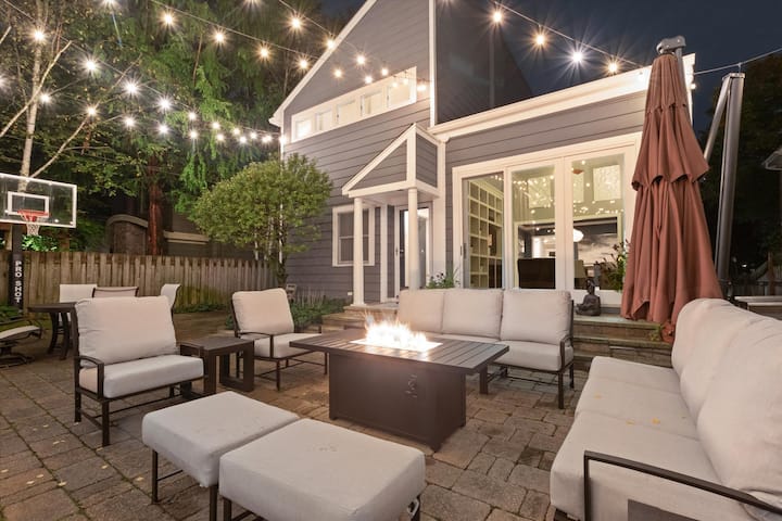 Mapambo ya ndani ya mapambo na oasisi ya ua wa nyuma, na kipengele cha maji ya bwawa la mto yanayotiririka, sehemu ya nje ya kula na sebule iliyo na taa ya kamba ya juu ili kuweka hisia nzuri.