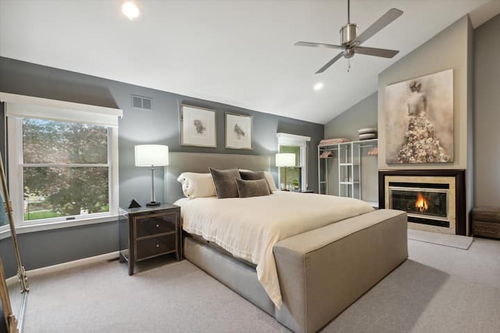 Chumba kikuu cha kulala kina kitanda cha kifalme kinachoweza kurekebishwa, televisheni mahiri ya inchi 55 iliyo na kebo maalumu, meko ya gesi na bafu kuu la kujitegemea. Bafu kuu lina vitu viwili vya ubatili, beseni la kina, joto, bafu mbili na chumba cha mvuke.