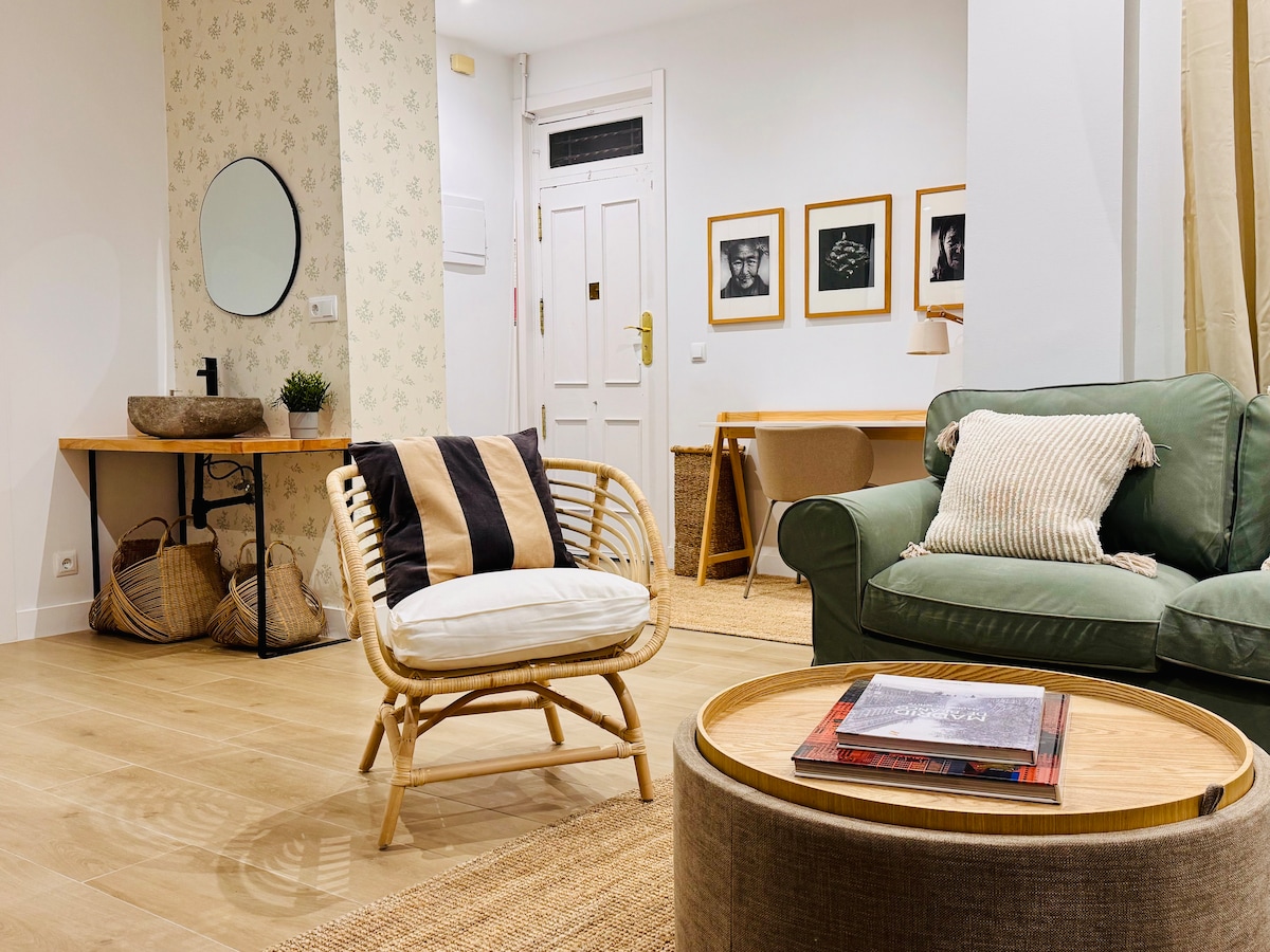 Fleti ya "Mizabibu" iko katikati ya Madrid, mbali na Gran Via, kwenye barabara iliyotulia katika jengo jipya lililo na lifti. Ina mandhari ya asili, angavu na ya kisasa, ina Wi-Fi, ina vifaa kamili na iko karibu na mikahawa, tapas, Metro, maduka na nyumba za sanaa. Bora kwa ajili ya wanandoa, au wanandoa na mtoto! Wanyama vipenzi wanaalikwa kwa furaha!!! Fleti iko katika buliding mpya, na lifti! Ni ya kisasa iliyoundwa, na mengi ya kijani, themed kwa jina lake, Vine. Dirisha kubwa kando ya urefu wa fleti nzima linatazama bustani nzuri ya kibinafsi. Fleti ina chumba cha kulala kilicho na kitanda cha watu wawili, eneo la kuishi lenye sofa moja ya kuvuta, jiko na bafu. Ina WiFi na ina vifaa kamili, ikiwa ni pamoja na mashine ya kuosha, TV, hali ya hewa, na mtengenezaji wa kahawa wa Nespresso - yote tayari tu kwa faraja yako na starehe! Fleti ni fleti ya wazi ya studio - na yote ni yako kufurahia! Hakuna maeneo katika fleti ambayo huwezi kutumia au kufikia! Tunapenda kukaribisha wageni, lakini pia tunaheshimu faragha ya wageni wetu! Tuko hapa kwa ajili yako kadiri unavyotaka! Iko mbali na Gran Via katika kitongoji cha kupendeza cha Malasana na aina yake kubwa ya mikahawa halisi, tapas na baa. Kubwa Zara Primark & Mango ni dakika mbali. Maeneo bora ya Madrid kama vile Jumba la Kifalme, Puerta del Sol na Makumbusho yako katika umbali wa kutembea Kituo cha Metro cha Kati cha Gran Via ni mwendo wa dakika 2 kutoka kwenye fleti. Kutoka hapo unaweza kuchukua metro hadi mahali popote unapotaka huko Madrid na pia kwa vituo vyote vya treni ambavyo vitakutoa nje ya Madrid hadi Hispania yote. Ikiwa unakuja kwa gari, maegesho makubwa yapo Barco 1, Madrid, dakika moja tu kutoka kwenye fleti. Pia kuna kituo cha kukodisha baiskeli karibu. Vifaa vya kukaribisha maji, soda, maziwa, kahawa, chai na vitamu vitakuwa vikisubiri kukukaribisha :-)