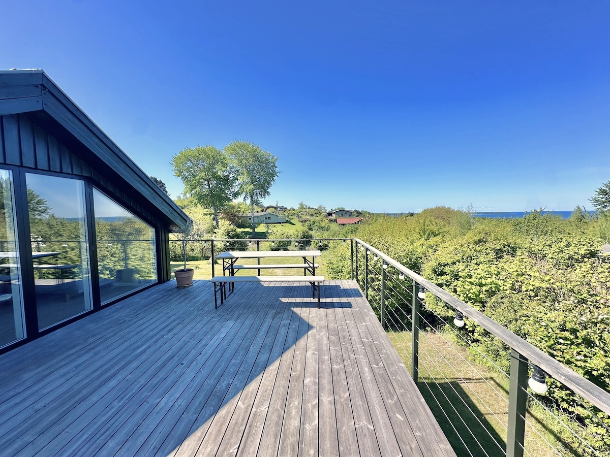 Pata uzoefu katika nyumba yetu ya kipekee ya majira ya joto, inayoangalia mojawapo ya mandhari ya kupendeza zaidi ya Denmark. Pamoja na panorama yake ya digrii 180, mtaro hutoa machweo ya mwaka mzima na madirisha makubwa hufurika mambo ya ndani na mwanga wa asili. Pumzika kwenye beseni la maji moto, changamoto kila mmoja kwenye tenisi ya meza, au bounce kwenye trampoline. Tembea kwa dakika 10 tu, ufukwe mzuri wa mawe. Nyumba yetu, iliyokubaliwa na asili na iliyojaa sanaa, inaahidi mapumziko ya ajabu.