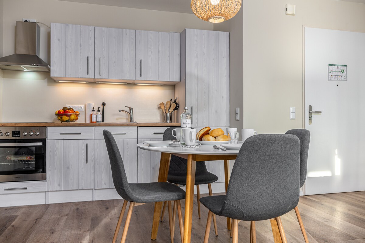 Fleti hii iliyokamilika hivi karibuni inachanganya haiba ya nyumba ya zamani na muundo wa kisasa na inatoa mazingira ya mtu binafsi. Katikati ya fleti ni jiko lililo wazi lenye meza nzuri ya kulia chakula chini ya mwangaza mkubwa wa anga. Fleti ina vyumba viwili tofauti vya kulala na mtaro mdogo ulio na mapumziko katika bustani tulivu. Ufukwe mzuri wa Bahari ya Baltic unaweza kufikiwa kwa dakika 8 tu kwa miguu au kwa dakika 3 kwa baiskeli.